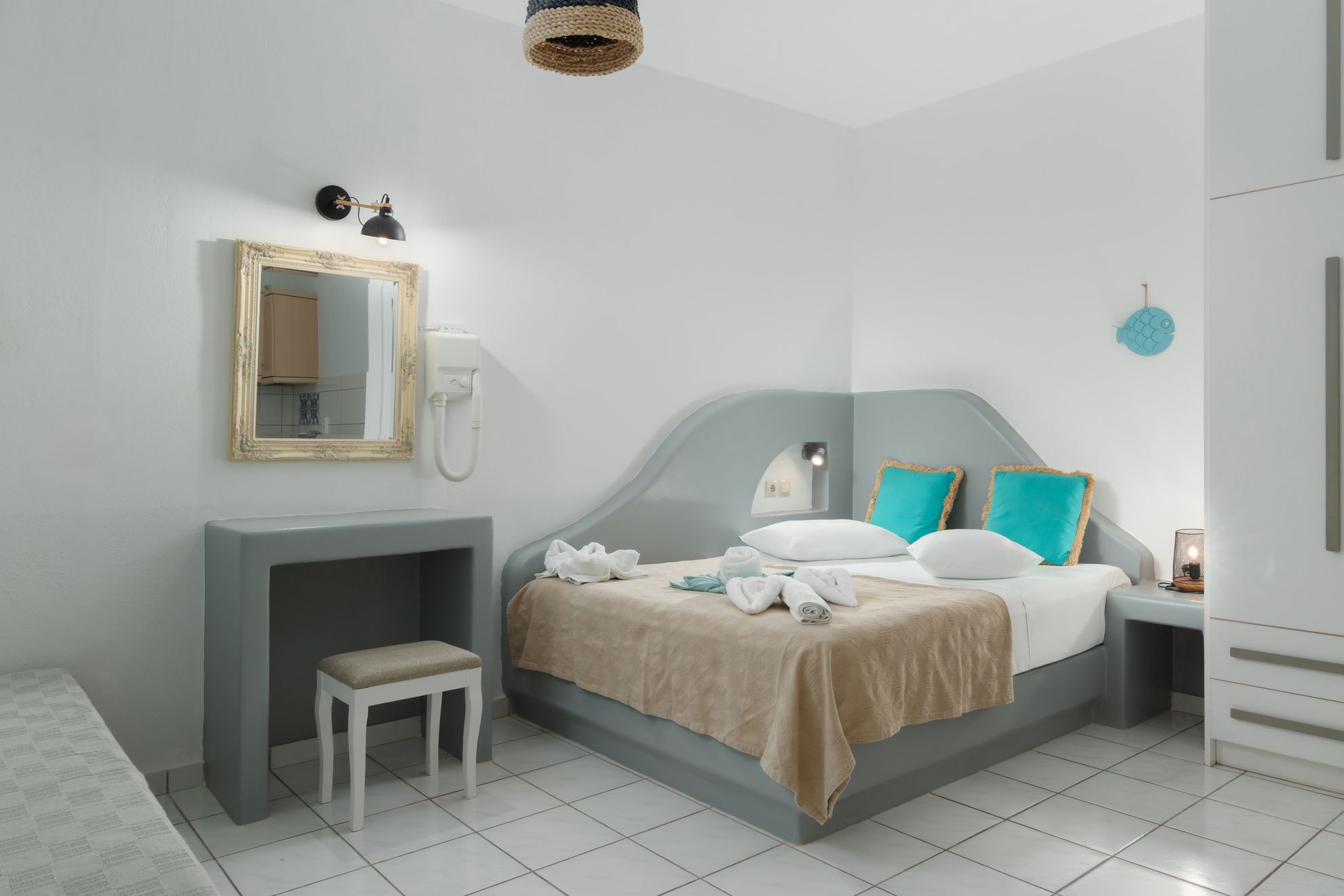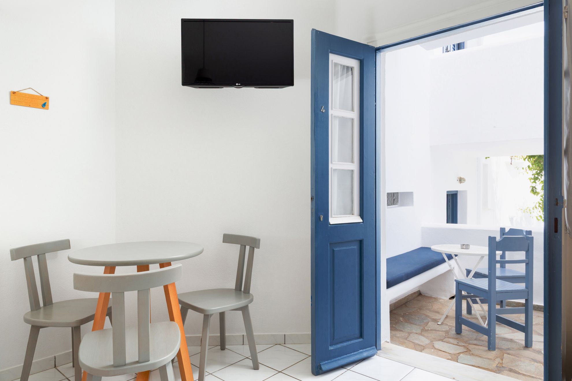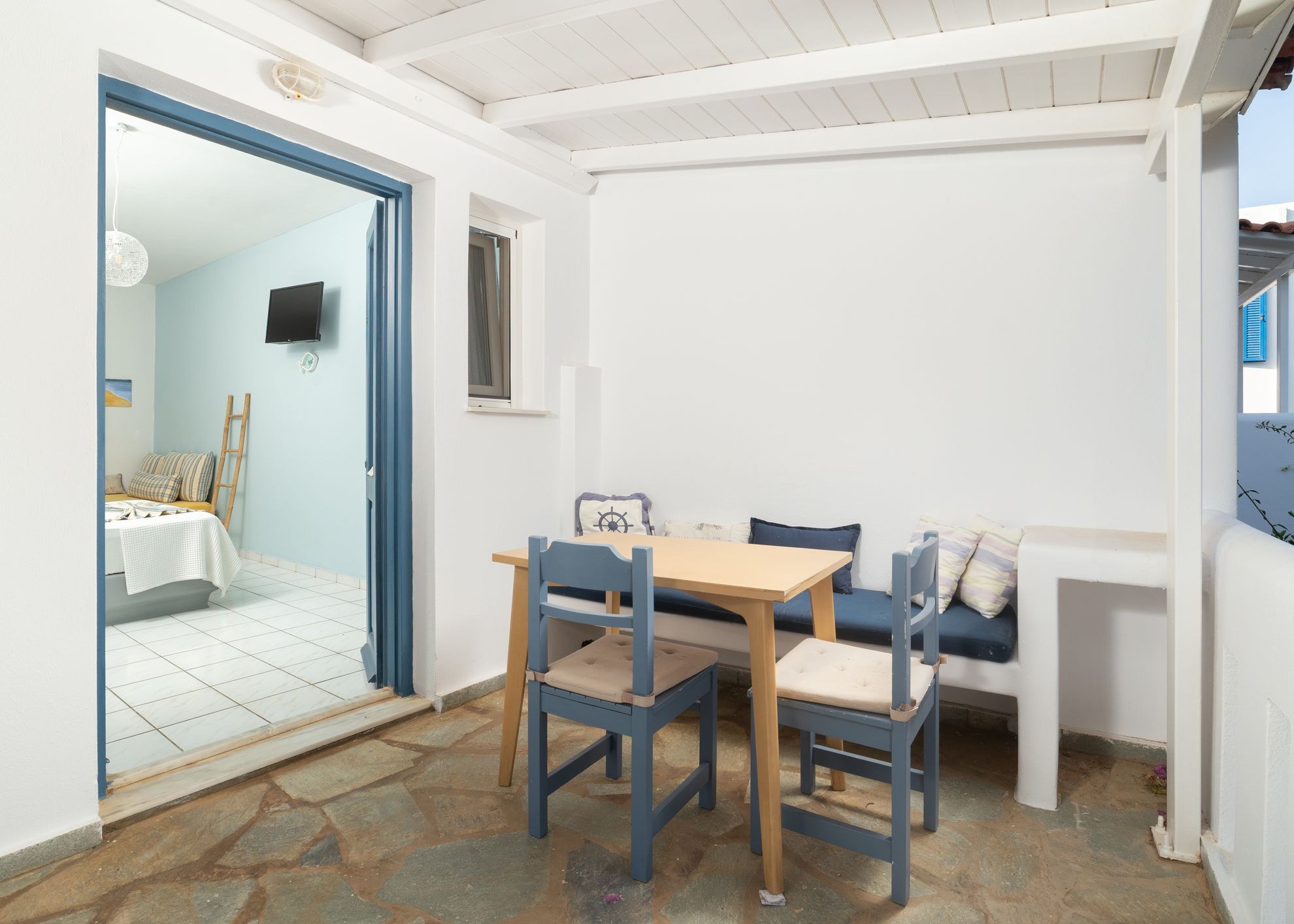 We offer four different triple rooms (rooms 3, 4, 8 and 11), each with its own decor and layout. All are set within a green garden, just a two-minute walk from the expansive sandy beach of Agios Petros — one of the most serene and authentic sides of the island.
