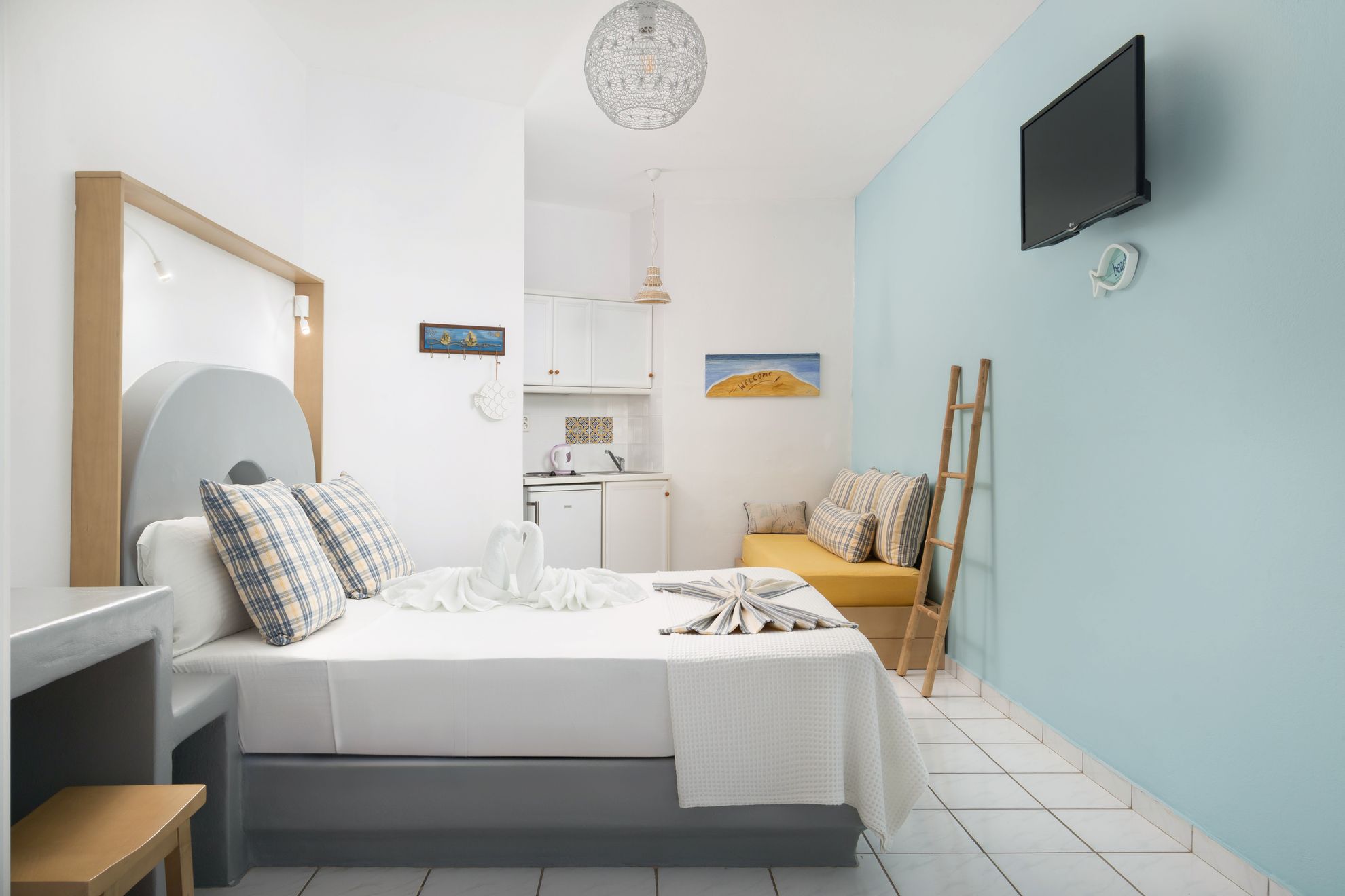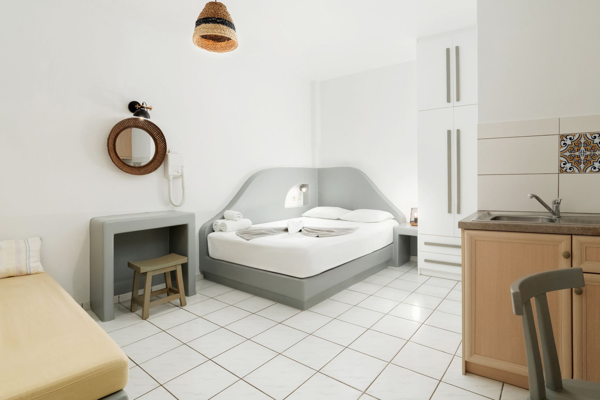 The Superior Triple Studio is Studio Irene's triple room that combines comfort for three with authentic Cycladic atmosphere. It has one double and one single bed in a single spacious space, ideal for small families, groups of friends or couples with one child looking for more room during their stay in Andros.